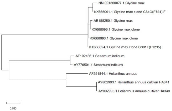 Cluster and phylogenetic analysis among various accessions of Glycine max, Sesamum indicum, and Helianthus annuus based on the FAD2 gene. Phylogenetic analysis was based on the sequence homology of FAD2 transcripts downloaded from gene bank https://www.ncbi.nlm.nih.gov/genbank/, accessed on 9 May 2024 and analyzed through MEGA X software.