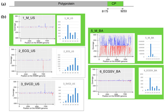 Investigation of the mapped viral reads in the case of WSMV. (a) shows the genome organization, while (b) shows the coverage of the viral genome by sRNAs and the size distribution of the viral reads in the indicated libraries. Plots are presented for libraries where the presence of the virus has been detected by RT-PCR. Green marks libraries where sRNA HTS detected the presence of the virus. On (a) CP encodes the coat protein of the virus. On (b) blue marks the small RNAs with sense and red with antisense orientation.