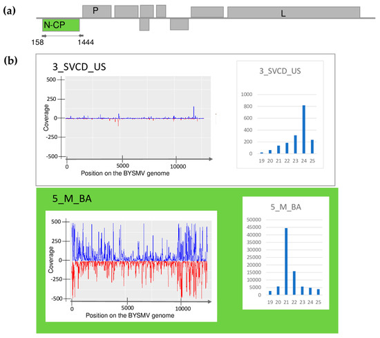 Investigation of the mapped viral reads in the case of BYSMV (a) shows the genome organization, while (b) shows the coverage of the viral genome by sRNAs and the size distribution of the viral reads in the indicated libraries. Plots are presented for libraries where the presence of the virus has been detected by RT-PCR. Green marks libraries where sRNA HTS detected the presence of the virus. On (a) P and L encode the P and L protein and N-CP is the coat protein of the virus. On (b) blue marks the small RNAs with sense and red with antisense orientation.