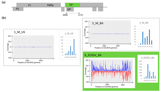 Investigation of the mapped viral reads in the case of BVG (a) shows the genome organization, while (b) shows the coverage of the viral genome by sRNAs and the size distribution of the viral reads in the viral reads in the indicated libraries. Plots are presented for libraries where the presence of the virus has been detected by RT-PCR. Green marks libraries where sRNA HTS detected the presence of the virus. On (a) P0 and P1 encodes the P0 and P1 protein, RdRP is the RNA-dependent RNA polymerase, MP is the movement protein, and CP is the coat protein of the virus. On (b) blue marks the small RNAs with sense and red with antisense orientation.