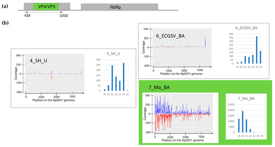 The investigation of the mapped viral reads in the case of ApGlV1 (a) shows the genome organization, while (b) shows the coverage of the viral genome by sRNAs and the size distribution of the viral reads in the indicated libraries. Plots are presented for libraries where the presence of the virus has been detected by RT-PCR. Green marks the libraries where sRNA HTS detected the presence of the virus. On (a) VP4 and VP3 encodes the P4 and P3 protein, and RdRP is the RNA-dependent RNA polymerase of the virus. On (b) blue marks the small RNAs with sense and red with antisense orientation.