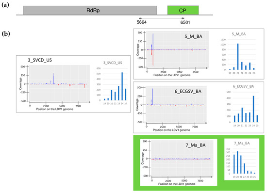 The investigation of the mapped viral reads in the case of LDV1 (a) shows the genome organization, while (b) shows the coverage of the viral genome by sRNAs and the size distribution of the viral reads in the indicated libraries. Plots are presented for libraries where the presence of the virus has been detected by RT-PCR. Green marks libraries where sRNA HTS detected the presence of the virus. On (a) RdRP encodes the RNA-dependent RNA polymerase, and CP is the coat protein of the virus. On (b) blue marks the small RNAs with sense and red with antisense orientation.