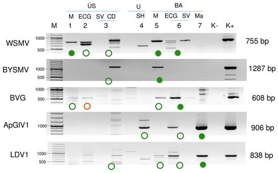 Virus diagnostics using RT-PCR and virus-specific primers. Circles indicate positive results, green when Sanger sequencing confirmed the presence of the virus, and red when Sanger sequencing did not confirm the RT-PCR result. Each library is represented only by one circle. Filled circles show cases with the same sRNA HTS result. M—stands for a GenRuler 100 bpPlus, used as a molecular marker. ÚS—Újmajor susnyás; U—Újmajor; BA—Büdös árok; M—P. miliaceum; ECG—E. crus-galli; SV—S. viridis; CD—C. dactylon; Ma—Z. mays. K− is the negative control, while K+ is the positive control.