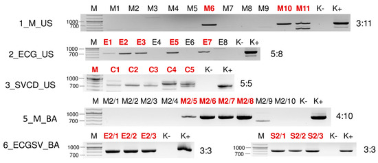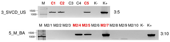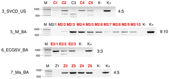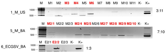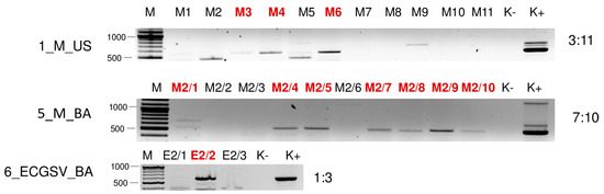 Virus diagnostics using RT-PCR to test the presence of BVG in the sampled individuals. amplifying a 523 bp long part of the BVG genome using BVG_700F and BVG_1223R in cases of 1_M_US and 5_M_BA and a 607 bp long part of the BVG genome using BVG_3508F and BVG_4115R primers in case of 6_ECGSV_BA (sequences are available in Table S4). M stands for a GenRuler 100 bpPlus, used as a molecular marker. K− is the negative control, while K+ is the positive control. Red indicates positive individuals. The codes of the sRNA HTS libraries and the numbered individuals are marked based on Table A1. The infection rate of the plant species is also indicated.