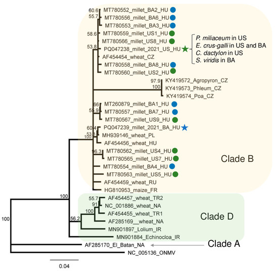 Sequencing PCR products originating from the species pool showed the absence of the SNPs, showing no sequence variation within the amplified virus part. That is why only one PCR product amplified from each species pool was cloned and sequenced. Although we sequenced WSMV strains in six cases, we only found two variants (PQ047238_2021_MUS and PQ047239_2021_MBA) (Table S5). The sequence of the MUS strain, present in millet in US, which was found in E. crus-galli (both in US and BA), C. dactylon (in US), and S. viridis (in BA), and the MBA strain present in millet at BA was 98.8% identical (Table S6). They were also very similar (higher than 97% similarity) with the variants sequenced in millet in 2019). Comparing the WSMV strains sequenced in Hungary to other strains, this identity decreased to 81%. However, there are several different WSMV sequences available in the GenBank, some of them originate from another parts of the virus, which is why we could not take them into account during the phylogenetical analysis. The variants sequenced during this study cluster into Clade B with the previously sequenced European variants (Figure 8).