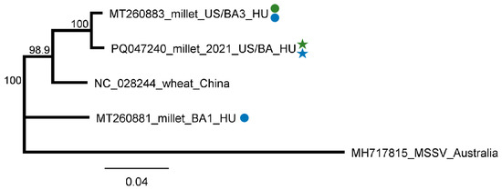 Phylogenetic analysis of the BYSMV strains originating from BA and US. The phylogenetic tree was constructed based on the 1287 nt long amplified and Sanger-sequenced, CP-coding part of the viral genome using Neighbour-Joining analysis and the Jukes–Cantor model, with 1000x bootstrap replications. Bars represent 4% nucleotide diversity. Sequences originating from our previous study are marked with circles, while sequences from this study are marked with stars. Green represents US, while blue represents BA. Sequences of the different strains are marked with their GenBank accession numbers, host species, and countries of origin. HU—Hungary. MSSV—maize sterile stunt virus (MSSV), used as an outgroup to root the tree.