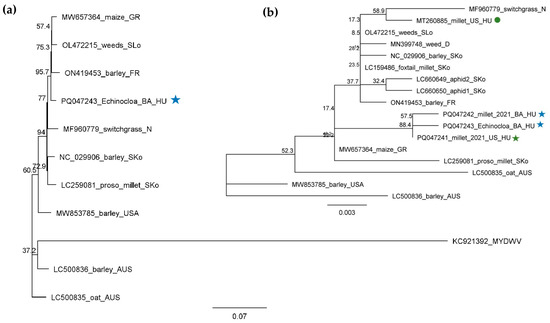 Phylogenetic analysis of the BVG strains originating from BA and US. The phylogenetic tree was constructed based on (a) nearly full (5362 nt long) BVG genomes and (b) on the 608 bp long amplified and Sanger-sequenced, CP-coding part of the viral genome using the Neighbour-Joining analysis and the Jukes–Cantor model, with 1000x bootstrap replications. Bars represent (a) 7% and (b) 0.3% nucleotide diversity. Sequences originating from our previous study are marked with circles, while sequences from this study are marked with stars. Green represents US, while blue represents BA. Sequences of the different strains are marked with their GenBank accession numbers, host species, and countries of origin. GR—Great Britain; SLo—Slovenia; FR—France; HU—Hungary; N—the Netherlands; SKo—South Korea; AUS—Australia; D—Germany. MYDWV—Maize yellow dwarf virus, used as an outgroup to root the tree.