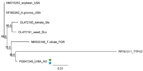 Phylogenetic analysis of the ApGlV1 strains originating from U and BA. The phylogenetic tree was constructed based on the 906 nt long amplified and Sanger-sequenced, VP4/VP3-coding part of the viral genome using the Neighbour-Joining analysis and the Jukes–Cantor model, with 1000x bootstrap replications. Bars represent 1% nucleotide diversity. Sequences originating from this study are indicated with stars. Green represents US, while blue represents BA. Sequences of the different strains are marked with GenBank accession numbers, host species, and countries of origin. SLo—Slovenia; POR—Portugal; HU—Hungary. PP791011—Tetranychus truncatus picorna-like virus 2 (TTPV2), used as an outgroup to root the tree.