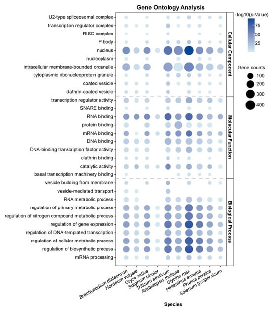 Gene Ontology (GO) analysis of prion–like protein (PrLP) genes across 10 plant species (Brachypodium distachyon, Hordeum vulgare, Oryza sativa, Sorghum bicolor, Triticum aestivum, Arabidopsis thaliana, Glycine max, Helianthus annuus, Prunus persica, and Solanum lycopersicum). Bubble size represents the number of genes, while color variation represents different p–values.
