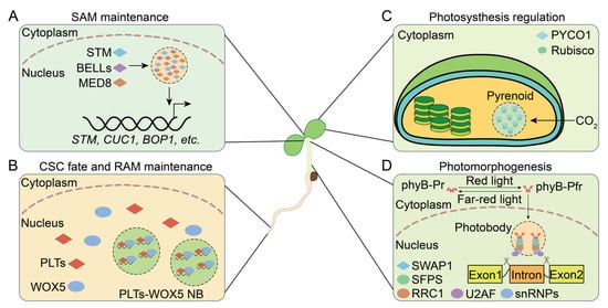 Plant growth relies on the meristem [84,85]. The root apical meristem (RAM) and shoot apical meristem (SAM) are regions containing pluripotent stem cells that maintain the stem cell niches (SCNs), enabling differentiation into root and shoot tissues [86,87]. Precise control of gene expression by key transcription factors is essential for maintaining stem cell activity in these meristem regions. Recent studies indicate that PrLD−containing transcription factors are crucial for RAM and SAM maintenance by modulating transcriptional regulation through promoting LLPS [43,88].
