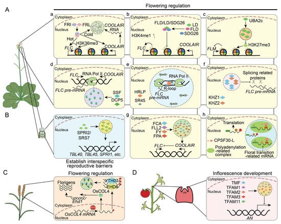 In addition, PrLPs also regulate post–transcription processes to affect flowering. The splicing efficiency of the FLC pre–mRNA is a critical determinant in producing mature FLC mRNA [54]. Two PrL–RBPs, KHZ1 (CCCH zinc–finger and KH domain–containing proteins 1) and KHZ2, can form homodimers or heterodimers. Their accumulation in nuclear speckles is associated with the reduced splicing efficiency of the FLC pre–mRNA [54] (Figure 3(Af)). COOLAIR, the long antisense RNAs transcribed from the downstream region of the FLC locus, are key modulators of the chromatin environment at the FLC locus [122,123]. The PrL–RBP FCA can form nuclear condensates in collaboration with the polymerase and nuclease components of the RNA 3’–end processing machinery and FLL2, a PrLP with coiled–coil domains. These condensates regulate polyadenylation at specific genomic sites, including proximal sites of COOLAIR nascent transcripts, thereby reducing transcriptional read–through. FLL2 promotes the formation of these condensates, and its overexpression leads to an increase in the size and number of these condensates. Other PrLD–containing proteins, such as FLL1, FPA, and FY, have been identified within the FCA condensates, indicating a complex interplay among these factors in gene expression regulation through phase–separated nuclear condensates [52] (Figure 3(Ag)). Moreover, PrLPs are involved in regulating mRNA stability through the recognition of m6A–modified mRNAs. In Arabidopsis, CPSF30–L enhances the formation of liquid–like nuclear bodies, primarily recognizing m6A–modified far–upstream elements (FUEs), and is crucial for controlling polyadenylation site choice by recruiting the polyadenylation complex. The cpsf30–l mutant leads to an elongation of the 3′ untranslated region (3′ UTR) of specific transcripts, including the floral transition–related gene SOC1 (SUPPRESSOR OF OVEREXPRESSION OF CONSTANS1), resulting in delayed flowering [51] (Figure 3(Ah)). Similarly, in rice, the PrLP EHD6 (EARLY HEADING DATE6) recruits YTH07, a PrLP recognized as an m6A reader, to form RNP granules. These granules facilitate the sequestration of the mRNA of the flowering repressor OsCOL4 (CONSTANS–like 4) in rice, which is critical for reducing OsCOL4 abundance and accelerating flowering [124] (Figure 3C).