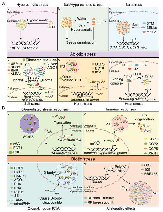PrLPs regulate plant adaptation to stresses. (A) PrLPs coordinate the plant’s response to abiotic stress. (a,b). PrLPs modulate plant responses to hyperosmotic stress. (b–d). PrLPs modulate plant responses to salt stress. (e,f). PrLPs govern plant responses to heat stress. (B) PrLPs exhibit responses to biotic stressors. (a,b). SGs or PB for immune responses. (c). D–bodies involved in pri–miRNA processing. (d). SGs assemble in response to allelopathic effects. Diamonds indicate PrLPs; ellipses represent other proteins; dashed circles indicate droplet–like condensates. AGO1: ARGONAUTE1; BELL: BEL1–like; CARP9: CONSTITUTIVE ALTERATIONS IN THE SMALL RNA PATHWAYS9; D–body: dicing body; DCL1: Dicer–like1; DCP: DECAPPING; ECT: EVOLUTIONARILY CONSERVED C–TERMINAL REGION; ELF3: EARLY FLOWERING 3; ELF4: EARLY FLOWERING 4; HYL1: Hyponastic Leaves1; m6A: N6–methyladenosine; PA: phenolic acid; PB: processing body; pri–miRNA: primary microRNA; RBP: RNA–binding protein; RBP47B: RNA–binding protein 47B; RH: RNA helicase; RNAi: RNA interference; RNP: ribonucleoprotein; RP: ribosome protein; SA: salicylic acid; SE: SERRATE; SEU: SEUSS; SG: stress granule; SGS3: SUPPRESSOR OF GENE SILENCING 3; STM: SHOOT MERISTEMLESS; TuMV: Turnip mosaic virus; UBP1b: OLIGOURIDYLATE BINDING PROTEIN 1b; VCS: VARICOSE; XRN: 5′–to–3′ exonuclease exoribonuclease.