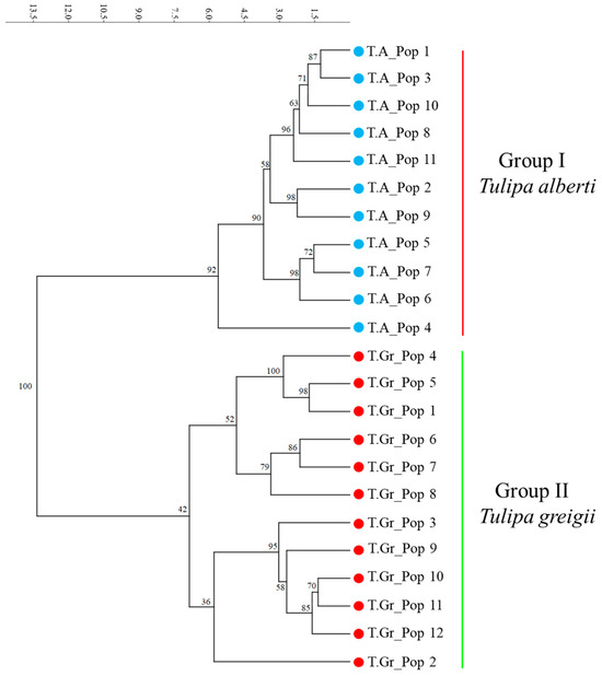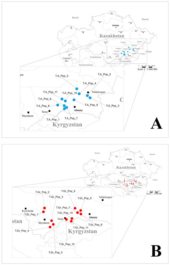 Yermagambetova, M.; Almerekova, S.; Ivashchenko, A.; Turuspekov, Y.; Abugalieva, S. Genetic Diversity of Tulipa alberti and T. greigii Populations from Kazakhstan Based on Application of Expressed Sequence Tag Simple Sequence Repeat Markers. Plants 2024, 13, 2667. https://doi.org/10.3390/plants13182667