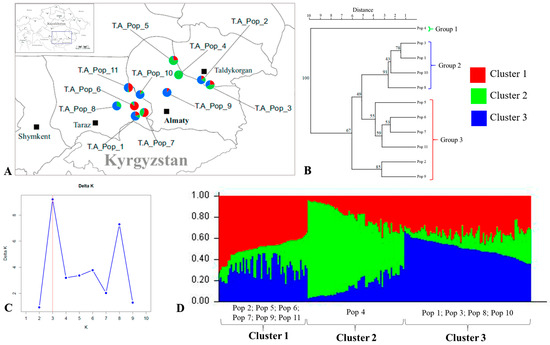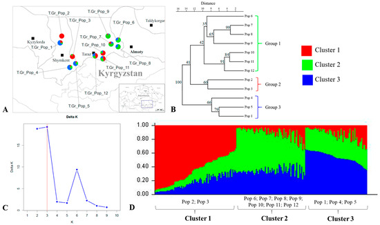 - Evanno, G.; Regnaut, S.; Goudet, J. Detecting the number of clusters of individuals using the software structure: A simulation study. Mol. Ecol. 2005, 14, 2611–2620. [Google Scholar] [CrossRef]