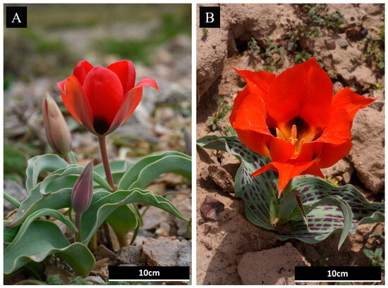 - Stork, A. Tulipes Sauvages et Cultivees (Wild and Cultivated Tulips; Serie Documentaire 13; Conservatoire et Jardin Botaniques: Geneva, Switzerland, 1984. [Google Scholar]