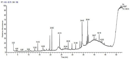 Gas chromatography–mass spectrometry (GC-MS) chromatogram of the methanolic extract of neem (A. indica); numbers above the peaks represented the retention times.
