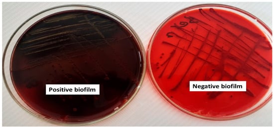 The four bacterial isolates B. cereus, N. aromaticivorans, K. pneumoniae, and S. marcescens were tested for biofilm formation on modified Congo Red agar medium containing sucrose, 30; beef extract, 5; peptone, 5; NaCl, 3; Congo Red, 0.8; and agar, 20 g/L. A single colony that was 24 h old from each isolate was streaked on the medium surfaces and incubated at 37 ± 1 °C for 72 h. After incubation, the biofilm formation was observed by turning the bacterial colonies into a black color, while the non-biofilm bacterial producers maintained their color [79].