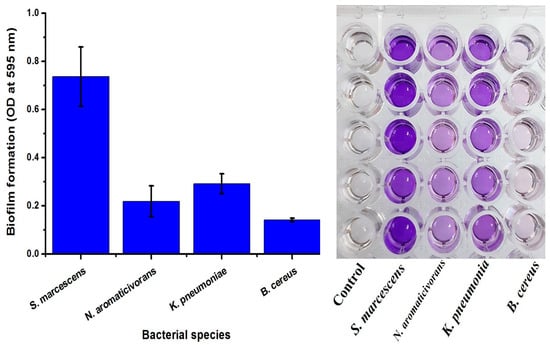 Biofilm biomass assessment of B. cereus, N. aromaticivorans, K. pneumoniae, and S. marcescens (OD at 595 nm) using microtiter plate assay.
