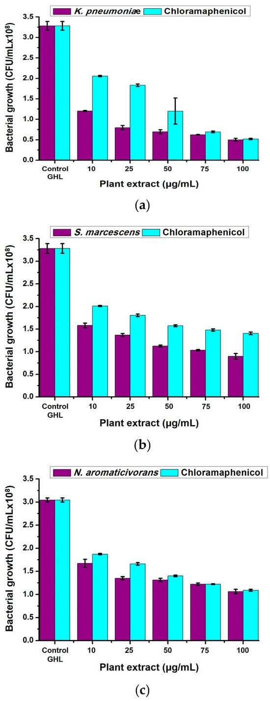 Antimicrobial activities of neem (A. indica) extract (10, 25, 50, 75, and 100 μg/mL) against (a): K. pneumoniae, (b): S. marcescens, and (c): N. aromaticivorans bacterial growth comparing with chloramphenicol (CHL) as positive control.