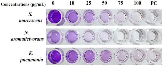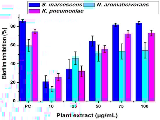 The antibiofilm activity of A. indica methanolic extract against bacterial biofilm formation by the Gram-negative bacteria N. aromaticivorans, K. pneumoniae, and S. marcescens was assessed using the microtiter plate assay following Yimgang et al. [81]. A 96-well microplate with a flat bottom was used; each well was filled with 100 μL of overnight bacterial culture and 10 μL of the extract at five concentrations (10, 25, 50, 75, and 100 μg/mL) against the positive control (PC) gentamicin (50 μg/mL) and incubated for 48 h at 37 °C. After incubation, free-floating cells were removed, and the bacterial biofilms were washed with phosphate buffer (pH 7.3). Then, the biofilms were stained with crystal violet 2%, and the absorbance values were measured using the microtiter plate reader at 595 nm (BioTek EPOCH, Winooski, VT, USA). Wells containing medium only were considered as a negative control, and gentamicin was used as a positive control. The percentage of biofilm inhibition was calculated as follows: