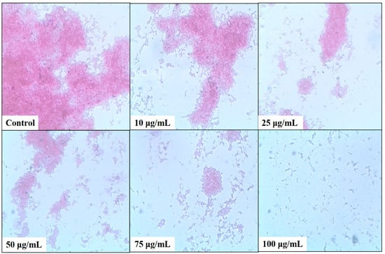 Sterilized falcon tubes (50 mL) containing sterilized glass pieces (1 × 1 cm) were prepared, and then 10 mL of sterilized LB medium growth media was added. Four concentrations (10, 25, 50, 75, and 100 μg/mL) of the methanolic extract were prepared and injected into tubes with bacterial inoculum (1%) added. The tubes were incubated for 24 h at 37 °C. Then, the glass slides were collated, washed with double-distilled water, and stained with 0.4% crystal violet. The stained-glass slides were examined for biofilm formation using a light microscope (Olympus CX41, Tokyo, Japan).