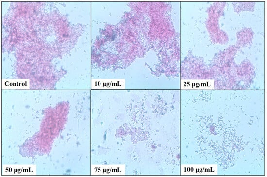 Light microscopic analysis of Serratia marcescens (Sm-26) biofilm treated with 10, 25, 50, 75, and 100 μg/mL of A. indica methanolic extract compared with the control sample.