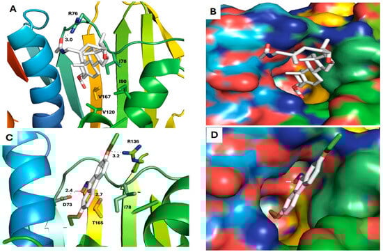 Docking models of pseudosolasodine diacetate and 9-oximino-2,7-diethoxyfluorene with DNA gyrase. (A,B) Stick model and surface map of pseudosolasodine diacetate docked model with DNA gyrase; it forms a hydrogen bond with ARG76. (C,D) Stick model and surface map of 9-oximino-2,7-diethoxyfluorene docked model with DNA gyrase; it forms hydrogen bonds with ARG136, THR165, and ASP73.