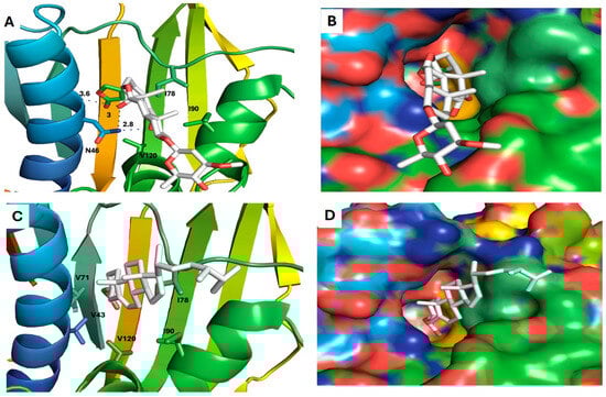 Docking models of sarreroside and ergosta-5,22-dien-3-ol, acetate, (3a,22E)- with DNA gyrase. (A,B) Stick model and surface map of sarreroside docked model with DNA gyrase; it forms a hydrogen bond with ASN46. (C,D) Stick model and surface map of Ergosta-5,22-dien-3-ol, acetate, (3a,22E)-docked model with DNA gyrase; it exhibits hydrophobic interactions with VAL43, VAL71, VAL120, ILE78, and ILE90.