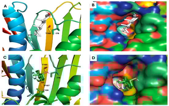 Docking models of cholestan-3-ol, 2-methylene-, (3a,5a)- and estra-1,3,5(10)-trien-17a-ol with DNA gyrase. (A,B) Stick model and surface map of cholestan-3-ol, 2-methylene-, (3a,5a)- docked model with DNA gyrase; it exhibits hydrophobic interactions with VAL71, THR165, and ILE78. (C,D) Stick model and surface map of estra-1,3,5(10)-trien-17a-ol docked model with DNA gyrase; it exhibits hydrophobic interaction with VAL120, VAL167, ILE78, and THR165.