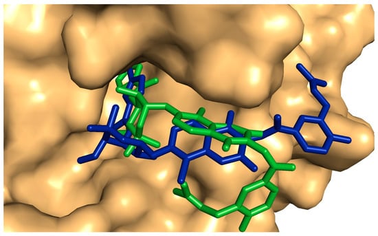 Surface representation of the superimposed redocked protein–ligand complex on the co-crystalized complex. Redocked ligand is blue, co-crystalized ligand is green.