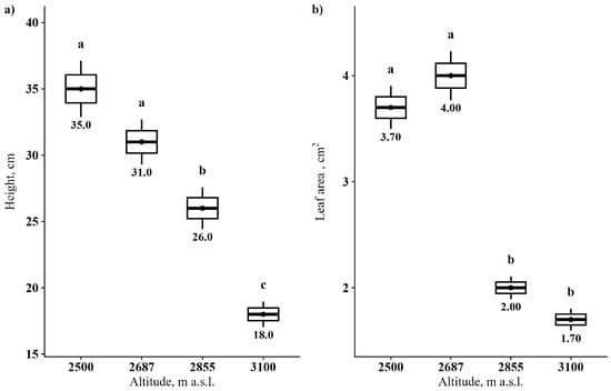 R. linearifolia morphometric parameter alterations depending on altitude. Note: (a) plant height, cm; (b) leaf area, cm2. Different letters within one parameter show significant difference (p < 0.05).