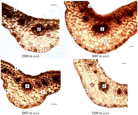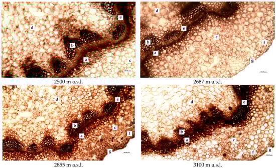 According to Table 2, all measured stem anatomical parameters also tended to decrease with increasing altitude. However, at 2687 m a.s.l., certain parameters such as stem collenchyma, chlorenchyma, and parenchyma thicknesses were significantly higher compared to the lowest altitude, surpassing values at 2855 and 3100 m a.s.l. Conversely, chlorenchyma thickness, vascular bundle diameter, and parenchyma thickness were the lowest at 2855 m a.s.l.