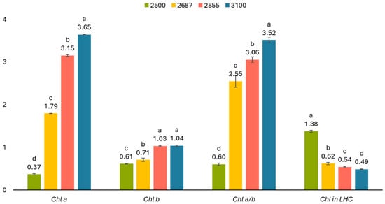The photosynthetic apparatus is fundamentally composed of light-harvesting pigment-protein complexes within the photosynthetic membranes. These complexes convert sunlight into electron excitation energy, which is then transferred to the photosystems’ reaction centers for primary energy storage [24,25]. The content of photosynthetic pigments, such as chlorophylls and carotenoids, is crucial for assessing plant viability, environmental response, and resistance to abiotic stresses. These pigments not only influence biomass yield but are also indicative of species-specific traits [26,27]. Given their role in light absorption and photochemical reactions in chloroplasts, analyzing the pigment pool of the photosynthetic apparatus is essential for understanding the dynamics of photosynthesis.