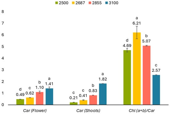 Changes in carotenoid content in flowers and shoots of R. linearifolia depending on altitude. The bars are arranged with increasing altitude from left to right. Different letters within one parameter show significant difference (p < 0.05).