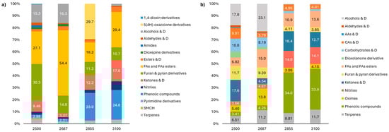 In the shoots, there was a notable rise in nitriles, along with a tendency toward an increase in fatty acids, fatty acid esters, and terpenes. Conversely, there was a decrease in the concentration of carbohydrates and their derivatives, aldehydes and their derivatives, amino acids and their derivatives, dioxolanone derivatives, as well as furan and pyran derivatives (Table S2)