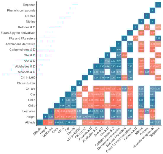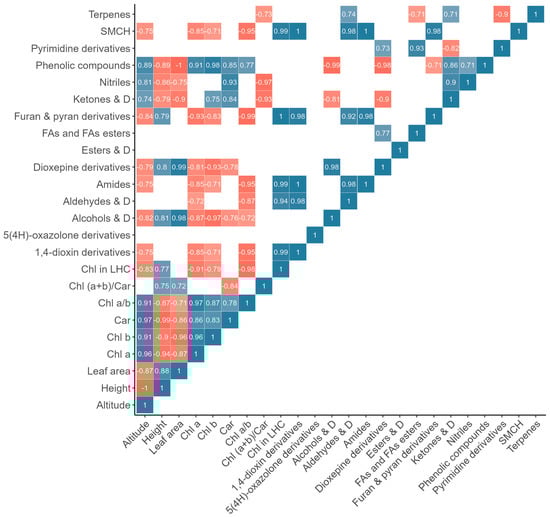 In the case of metabolite content in plant shoots, the content of furan and pyran derivatives (−0.93), aldehydes and their derivatives (−0.96), carbohydrates and their derivatives (−0.93), amino acids and their derivatives (−0.92), dioxolanone derivatives (−0.89), alcohols and their derivatives (−0.80), and carboxylic acids and their derivatives (−0.72) negatively correlated with altitude (Figure 9). Nitriles (0.88), phenolic compounds (0.87), and terpenes (0.73) content positively correlated with altitude. The content of fatty acids and fatty acid esters, ketones and their derivatives, and oximes showed no correlation with altitude (Figure 9).