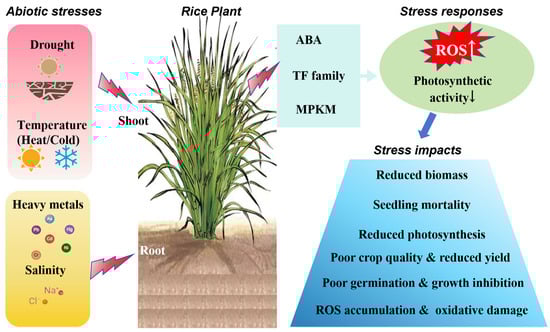 Abiotic stress poses a serious environmental threat, notably presenting a substantial risk to crop production. Among the various types of abiotic stress, drought stress, temperature stress, salt stress, and heavy metal stress have particularly profound impacts on rice production [23] (Figure 1).