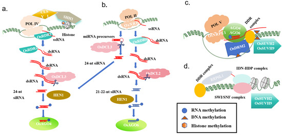 In plants, de novo methylation is mediated by the RNA-directed DNA methylation (RdDM) pathway [95] (Figure 2). The plant-specific RdDM pathway involves complex interactions between various RNAs and proteins [96,97]. It incorporates a series of biological macromolecules composed of small interfering RNAs (siRNAs), scaffold RNAs, and numerous protein molecules. It is the only pathway in plants that can achieve de novo methylation of previously unmethylated DNA regions [98,99]. Two plant-specific factors are central to the mechanism of the RdDM pathway—POL IV and Pol V, both of which are RNA polymerase II (POL II)—related RNA polymerases [100,101]. Based on current models, the canonical RdDM pathway encompasses two successive stages: (a) biogenesis of 24-nucleotide (nt) siRNAs, which requires POL IV, RDR2, and DCL3, and (b) the initiation of de novo methylation, which depends on scaffold RNAs produced by POL V, 24-nt siRNAs bound to AGO4, and the de novo DNA methyltransferase DOMAINS REARRANGED METHYLTRANSFERASE 2 (DRM2) [100]. The RdDM pathway generates single-stranded RNA and double-stranded RNA, which are cleaved into 24-nt sRNAs by DICER-LIKE 3 (DCL3) [102,103,104] (Figure 2a). HUA-ENHANCER 1 (HEN1) methylation modification prevents the degradation of sRNA [105]. Mature sRNA binds to ARGONAUTE 4 (AGO4) [100,106,107] or AGO6 [108,109] and pairs with scaffold RNA transcribed by POL V to recruit DOMAINS REARRANGED METHYLASE 2 (DRM2) [110] for methylation modification (Figure 2c). In addition to the typical POL IV pathway, POL II can also generate siRNA to trigger non-canonical RdDM. While nearly all 24 nt sRNAs involved in RdDM are produced through the POL IV-RDR2-DCL3 pathway, a small proportion are produced through other pathways. For example, some POL II transcripts that contain an inverted repeat sequence form double-stranded hairpin structures that can be directly cleaved by DCL3 to form 24 nt sRNAs [111,112]. For the reverse activation of siRNA genes and some transcriptionally active transposon regions, RdDM relies on POL II and RNA-DEPENDENT RNA POLYMERASE 6 (RDR6) rather than POL IV and RDR2 [108,113,114]. There are also many factors involved in the RdDM passage, such as: AGO4 and/or AGO6 directly associate with POL V, and the association is enhanced by RNA-DIRECTED DNA METHYLATION 3 (RDM3). The production of scaffold RNAs by POL V requires the DDR complex, consisting of the chromatin remodeller DEFECTIVE IN RNA-DIRECTED DNA METHYLATION 1, DEFECTIVE IN MERISTEM SILENCING 3 and RDM1, which associates with both AGO4 and DRM2 and may bind single-stranded methylated DNA [115]. The DDR complex interacts with SUPPRESSOR OF VARIEGATION 3-9 HOMOLOGUE PROTEIN 2 (SUVH2) and SUVH9, which bind to pre-existing methylated cytosines and can recruit POL V [116]. The retention of nascent POL V-transcribed RNA on the chromatin may be facilitated by the RNA-binding proteins RRP6-LIKE 1 (RRP6L1) [117] and the INVOLVED IN DE NOVO 2 (IDN2)–IDN2 PARALOGUE (IDP) complex, which interacts with a SWITCH/SUCROSE NONFERMENTING (SWI/SNF) chromatin-remodelling complex [118,119].