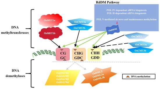 METHYLTRANSFERASE 1 (MET1) was the first plant methyltransferase to be identified and maintains CG methylation in gene-coding regions [120]. In rice, CG methylation is primarily maintained by the MET1 genes, including OsMET1a (OsMET1-1) and OsMET1b (OsMET1-2). Of these genes, OsMET1b is the primary methyltransferase responsible for maintaining CG methylation, and its expression is more widespread and at a higher level compared with that of OsMET1a [121].