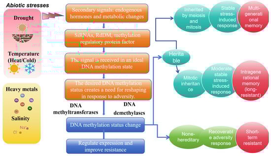 Based on the foregoing literature, it is concluded that heavy metal stress can also cause DNA methylation alterations in diverse plant genomes. With respect to epigenetic continuity, heavy metal stress appears to have a greater and more pronounced effect than drought stress (Figure 4).