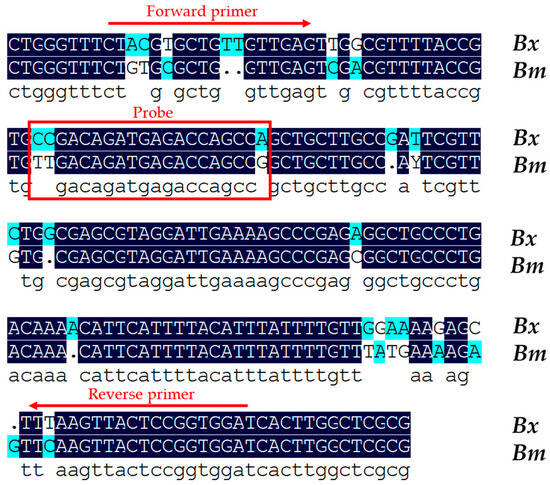 Alignment of the consensus 16SrDNA sequence from the B. xylophilus (Bx) and B. mucronstus (Bm) isolates. The forward primer and reverse primer are indicated by red arrows, and the probe is indicated by a red box. The consensus DNA sequence from B. xylupholus and B. mucronstus is highlighted with a dark-blue background. Dots indicate gaps in the corresponding sequence that were added for the alignment.