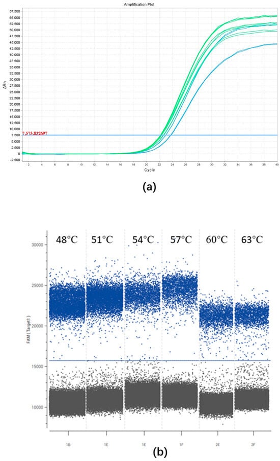 To determine the most suitable annealing temperature for the ddPCR assay, temperatures of 48 °C, 51 °C, 54 °C, 57 °C, 60 °C, and 63 °C were tested. Slight variations in fluorescence intensity were observed between negative and positive droplets at the different annealing temperatures, with the highest fluorescence intensity recorded at 57 °C. Consequently, 57 °C was selected for subsequent ddPCR tests (Figure 2b).