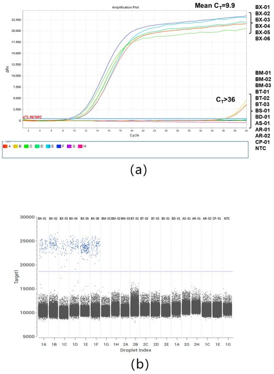 The specificity of the ddPCR and qPCR assays was confirmed using DNA extracted from 6 isolates of B. xylophilus (BX) and 12 other nematode isolates (Table 2). The DNA samples from all B. xylophilus isolates were positive, whereas the DNA samples extracted from the other nematode isolates were negative in the ddPCR and qPCR assays (Figure 3a,b).