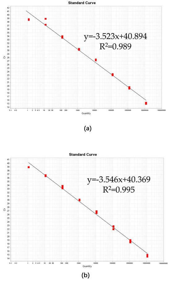 Standard curves were created for the qPCR assay using 10-fold dilutions of positive plasmids (Figure 4a) and positive plasmids spiked with pine wood DNA extract (Figure 4b) to compare the linearity and PCR efficiency between the plasmid samples and the spiked samples. Using positive plasmid DNA (1.20 × 107–1.20 × 100 copies/μL), both tests showed good linearity (R2 = 0.989 and R2 = 0.995) across the investigated dynamic range. The qPCR standard curves for the positive plasmid DNA possessed a slope of −3.523, indicating a PCR efficiency of 92.246%, while the qPCR curves of the spiked samples had a slope of −3.546, indicating a PCR efficiency of 91.419%. The Ct values and initial logarithmic concentrations of the qPCR serial dilution series are detailed in Table S1.