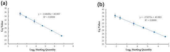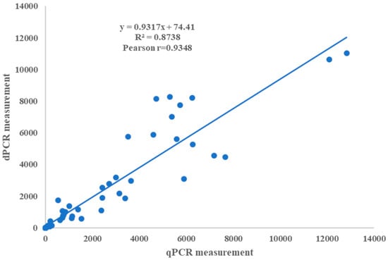 Regression curves were established for the qPCR (Figure 5) using a series of 5-fold dilutions of positive plasmids and spiked samples to compare the analytical sensitivity, linearity, and dynamic range between the qPCR and ddPCR. Using positive plasmid DNA (1.32 × 104–0.84 × 10−1), the qPCR tests for both plasmid DNA and spiked samples showed excellent linearity, with corresponding R2 values of 0.999 across the investigated dynamic range. The qPCR tests’ calculated sensitivities for the plasmid DNA and spiked samples were estimated to be 18.67 copies/μL and 34.35 copies/μL, respectively. The qPCR serial dilution series’ Cq values and initial logarithmic concentrations are detailed in Table S2.