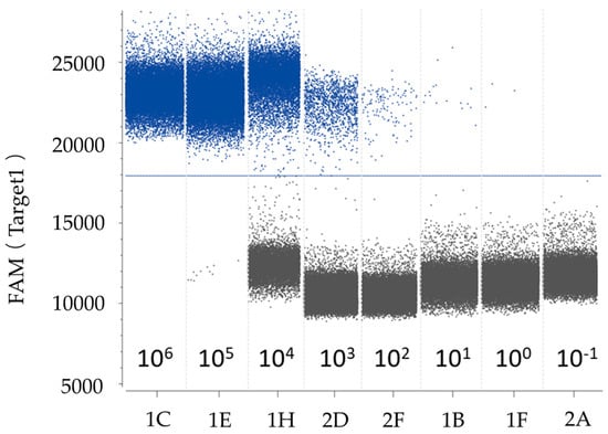 A representative 1-D plot of ddPCR reactions. The ordinate indicates the fluorescence amplitude, and the blue line is the threshold. Above the threshold are positive droplets (blue) containing at least one copy of the target DNA, and below the threshold are negative droplets (gray) without the target DNA. Eight ddPCR reactions with various serially diluted targets are divided by the vertical dotted line. When the target DNA exceeded 106, the ddPCR reaction was saturated by an excess target DNA concentration, and when the target DNA was 10−1, the ddPCR reaction provided a negative result.