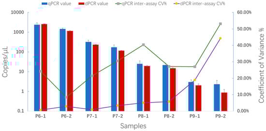 Eight positive plasmid DNA samples were utilized to assess the reproducibility of qPCR and ddPCR. As depicted in Figure 8, ddPCR demonstrated superior reproducibility in comparison to qPCR (CV% decreased by 97.4–16.5%; numerical data that support Figure 8 are provided in Table S3), indicating that fewer repetitions were acceptable in this experiment.