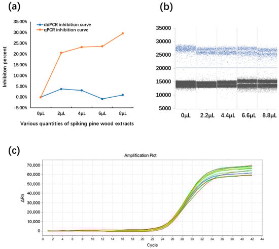 The influence of samples spiked with different volumes of pine wood extracts. ddPCR exhibited superior tolerance to pine wood extracts compared to the qPCR assay. qPCR was more susceptible to the inhibitors (a). In the ddPCR assays, the fluorescence intensity of positive droplets decreased slightly with an increase in the inhibitor volume (b). In the qPCR assays, the fluorescence curves exhibited no significant differences between different volumes of inhibitors (c) (numerical data supporting Figure 9 are provided in Table S5).
