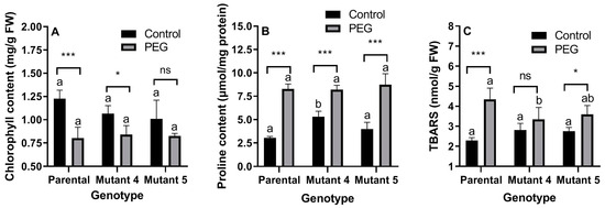 Effects of PEG-induced osmotic stress on chlorophyll content (A), proline content (B), and TBARS content (C) of the parental line (commercial cultivar) and its mutant lines 4 and 5. Values are the arithmetic means of biological pentaplicates (n = 5), and the error bars correspond to the standard deviations (SD). Significant differences were determined according to Tukey’s HSD test performed after a 2-way ANOVA. The letters on the columns represent the statistical significance among the genotypes under the same conditions (control or PEG). Columns indicated by different letters are statistically different (p < 0.05). Asterisks represent the statistical significance of a genotype between different conditions as follows: * p < 0.05, *** p < 0.001, and ns (not significant).