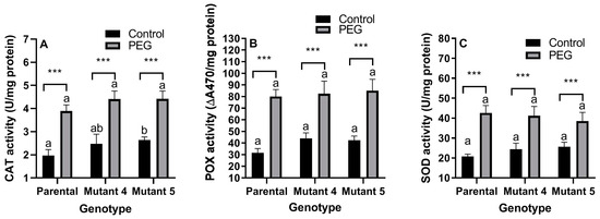 Effects of PEG-induced osmotic stress on the activities of the enzymes CAT (A), POX (B), and SOD (C) of the parental line (commercial cultivar) and its mutant lines 4 and 5. Values are the arithmetic means of biological pentaplicates (n = 5), and the error bars correspond to the standard deviations (SD). Significant differences were determined according to Tukey’s HSD test performed after a 2-way ANOVA. The letters on the columns represent the statistical significance among the genotypes under the same conditions (control or PEG). Columns indicated by different letters are statistically different (p < 0.05). Asterisks represent the statistical significance of a genotype between different conditions as follows: *** p < 0.001.